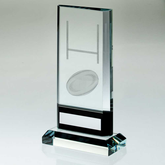 CLEAR/BLACK GLASS WITH LASERED RUGBY IMAGE AND PLATE (15mm THICK) - 7.5in. Free engraving on the supplied plate