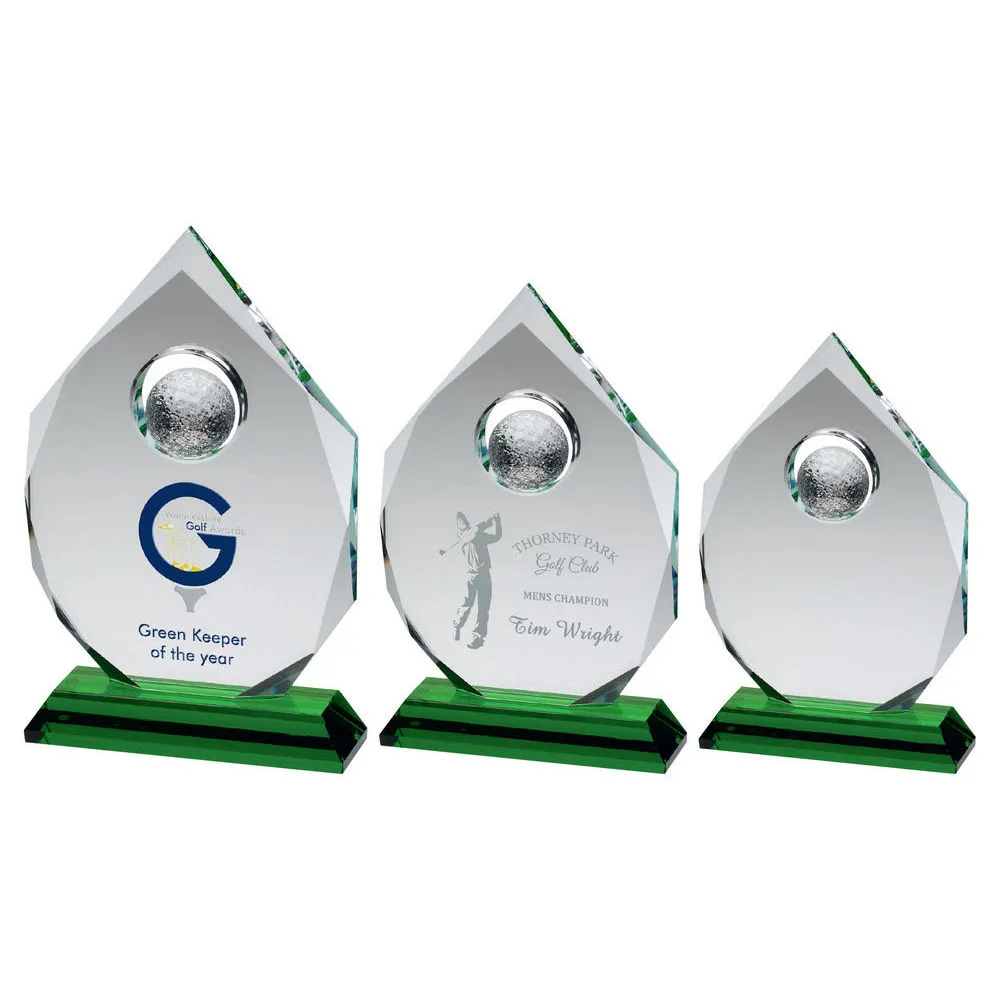 CLEAR GLASS DIAMOND WITH GOLF BALL ON GREEN BASE (15mm THICK)