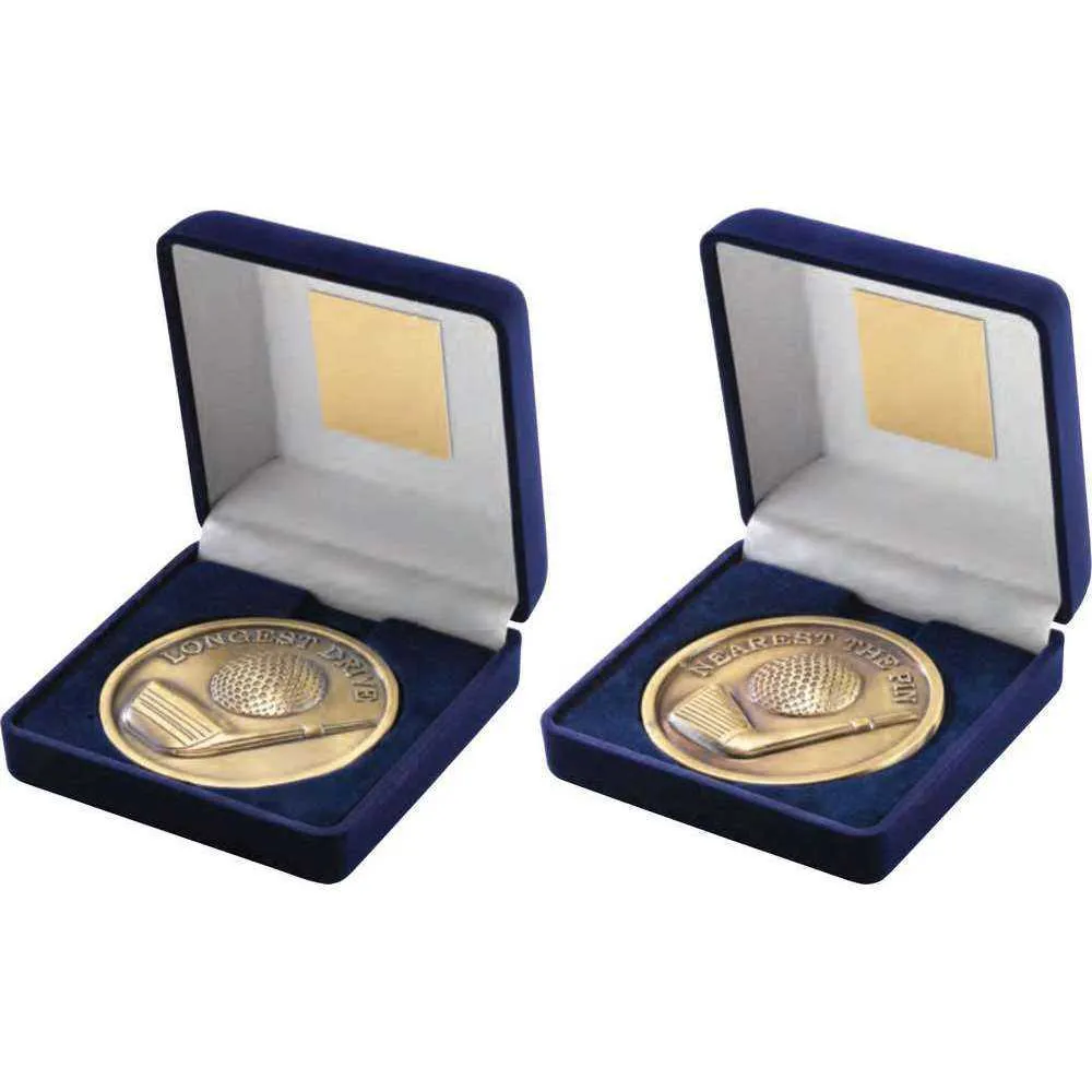 VELVET BOX AND 70mm MEDALLION GOLF TROPHY ANTIQUE GOLD NEAREST THE PIN