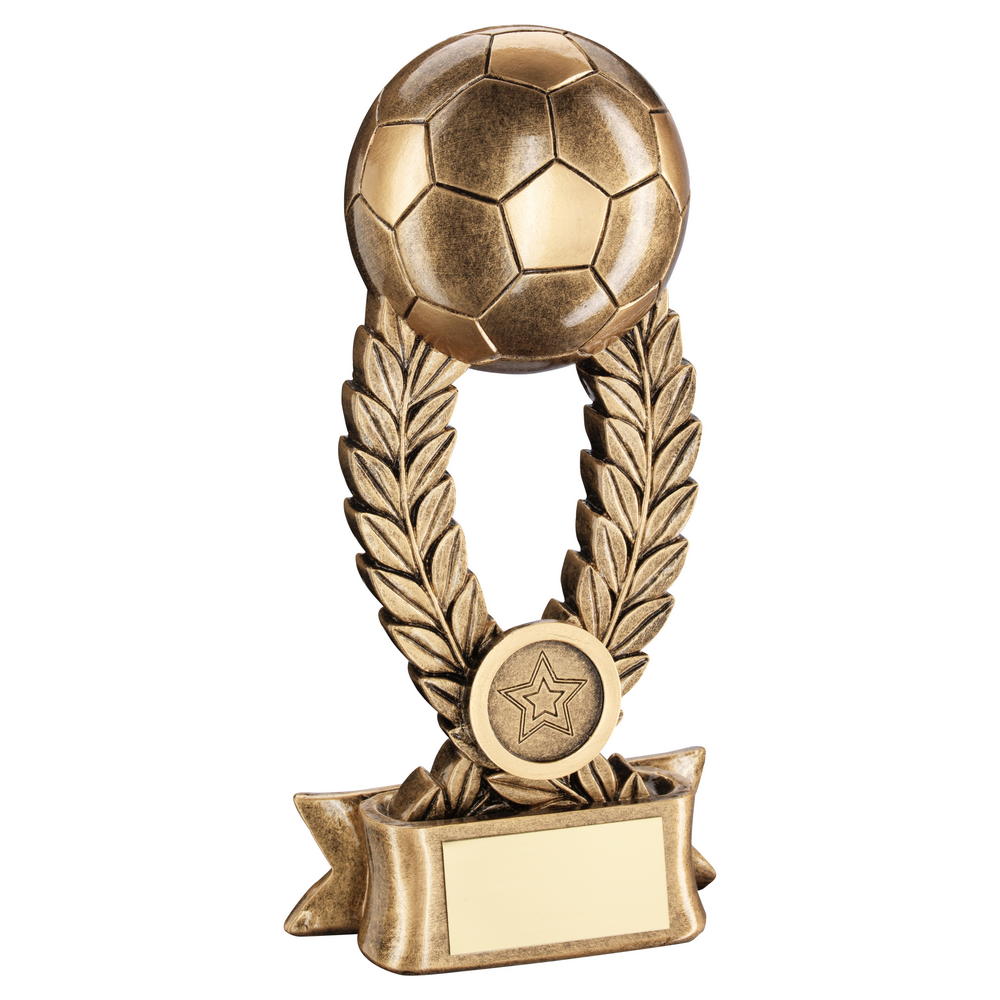 Football On Wreath Riser With Ribbon Base Trophy. A gold and bronze football on a wreath/laurel style riser. Free engtraving on the supplied plate. Available in different sizes.