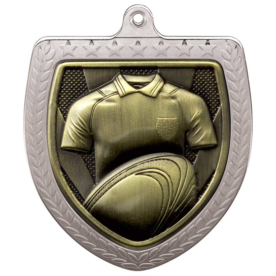 Cobra Rugby Shirt & Ball Shield Medal Silver 75mm