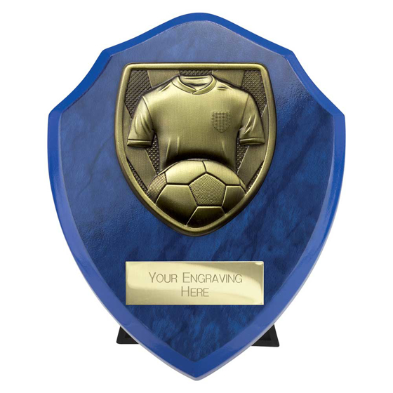 Cobra Shield Football Shirt & Ball Award Azure Blue 125mm. Free engraving on the supplied plate