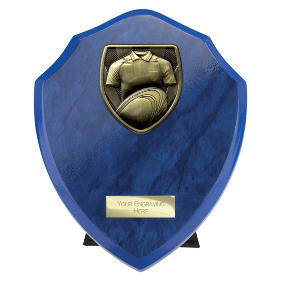 Cobra Shield Rugby Shirt & Ball Award Azure Blue 175mm. Free engraving on the supplied plate