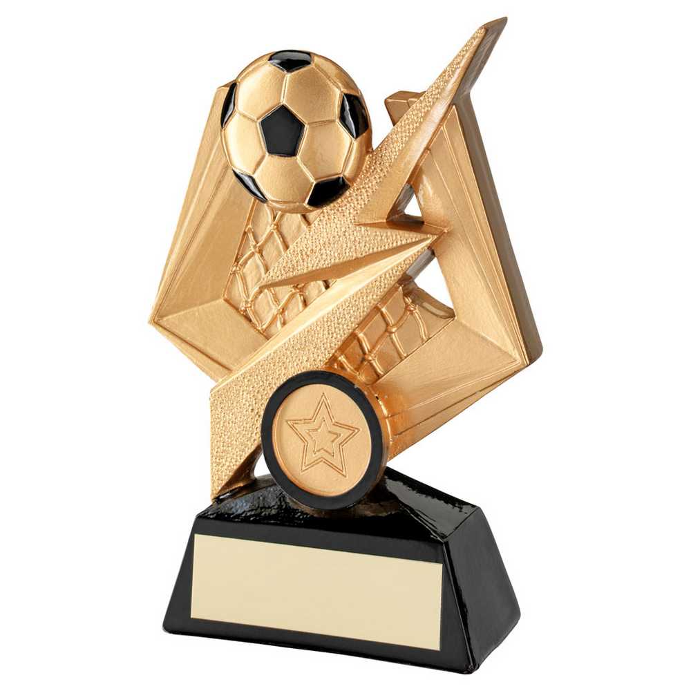GOLD/BLACK FOOTBALL ON BOLT PENTAGON WITH PLATE (1in CENTRE) - 6in. Free engraving on the supplied plate and free colour club logo.