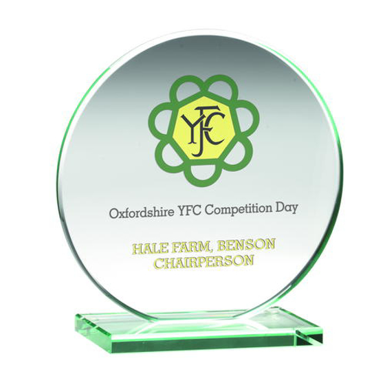 Jade Glass Round Plaque (10mm Thick) - 4.25in (108mm). This award can be engraved or have your design or logo colour printed on to it. Presentation boxes are sold separately.