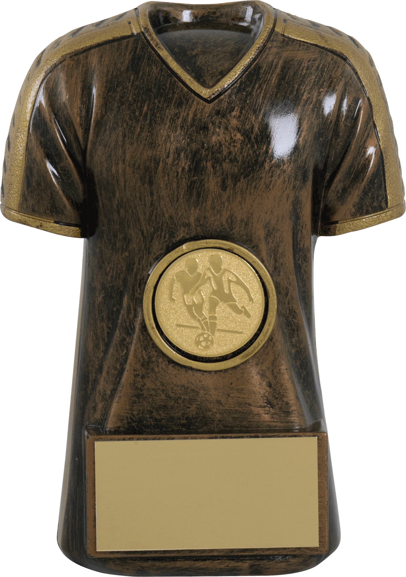 Meteor Bronze/Gold Football Shirt Award 5" 130mm. A heavyweight freestanding football shirt award in a contrasting Bronze/Gold colour. Available in different sizes. Free engraving on the supplied plate.