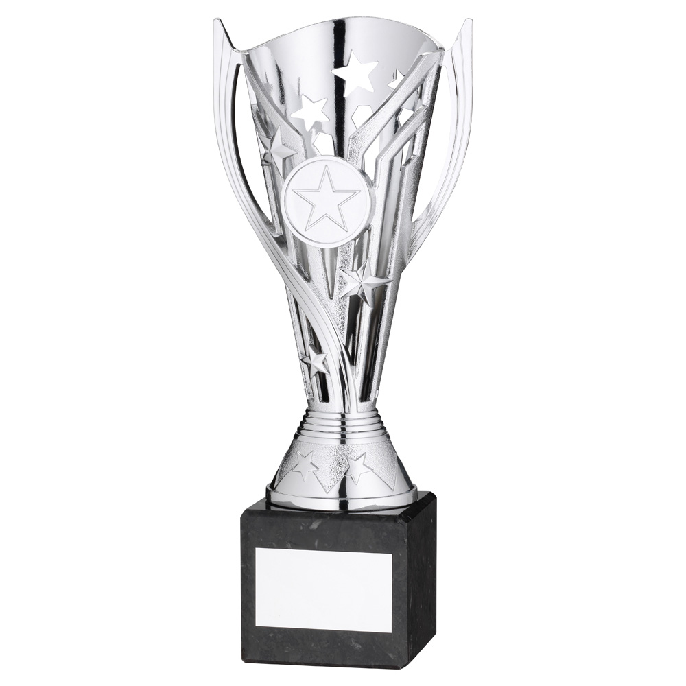SILVER PLASTIC 'FLASH' CUP ON BLACK MARBLE ASSEMBLED TROPHY (1" CEN) - 8in. Available in different sizes. Free engraving on the supplied plate.
